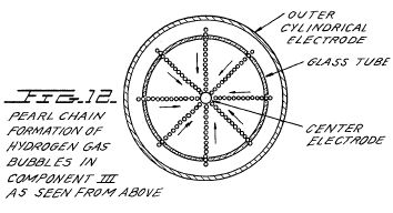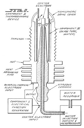 The TD is fabricated of metals and ceramic in the geometric form of a coaxial cylinder made up of a centered hollow tubular electrode which is surrounded by a larger tubular steel cylinder. These two electrodes comprise the coaxial electrode system energised by Component I. The space between the two electrodes is, properly speaking, Component III which contains the water solution to be electrolysed. The center hollow tubular electrode carries water into the cell, and is further separated from the outer cylindrical electrode by a porous ceramic vitreous material. The space between the two electrodes contains two lengths of tubular Pyrex glass, shown in Figures 2 and 3. The metal electrode surface in contact with the water solution are coated with a nickel alloy.