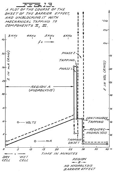 This input to Component III yields, by electrolysis of water, approximately 0.1 cm3 of hydrogen gas per minute at one atmosphere and 289° K. It is observed that as a function of time the fc crept up from 2978 Hz to 6474 Hz over 27 minutes. The current and the voltage also rose with time. At the 27th minute a barrier effect blocked the electrolysis of water, and one can best appreciate the cycle of events by reference to FIG. 13.
