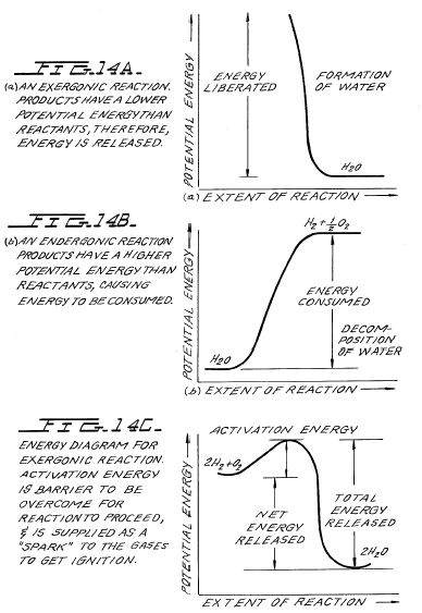 The chemical bonds of the water molecules have a lower energy content than the hydrogen and oxygen gases which serve at the reactants. Low energy molecules are characterized by their ability. High energy molecules are inherently unstable. These relations are summarized in the two graphs of FIG. 14. It is to be noted that FIG. 14 (b) shows the endergonic reaction aspect of the invention when water is decomposed by electrolysis into hydrogen and oxygen. FIG. 14 (a) shows the reaction when the hydrogen and oxygen gases combine, liberate energy, and re-form into water. Note that there is a difference in the potential energy of the two reactions. FIG. 14 (c) shows that there are two components to this potential energy. The net energy released, or the energy that yields net work is labelled in the diagram as Net Energy released, and is more properly called the free energy change denoted by the Gibbs function, -.DELTA.G. The energy which must be supplied for a reaction to achieve (burning) spontaneity is called the activation energy. The sum of the two is the total energy released. A first thermodynamic subtlety of the thermodynamic device of the invention is noted in Angus McDougall's Fuel Cells, Energy Alternative Series, The MacMillan Press Ltd., London, 1976, page 15 it is stated: