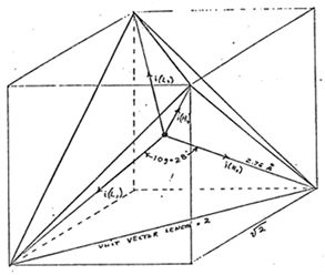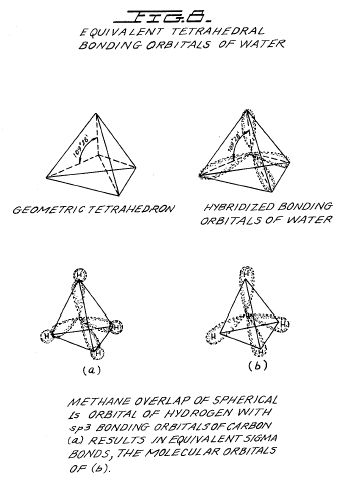 The Component III water solution is more properly speaking, ideally a 0.1540 M Sodium Chloride solution, and such is a weak electrolyte. In figure 4 we show the hypothetical tetrahedral structure of water molecule, probably in the form in which the complex electromagnetic waves of Component I to see it. The center of mass of this tetrahedral form is the oxygen atom. The geometric arrangement of the p electrons of oxygen probably determine the vectors i (L1) and i (L2) and i (H1) and i (H2) which in turn probably determine the tetrahedral architecture of the water molecule. The p electron configuration of oxygen is shown in Figure 5. Reference to Figure 4 shows that the diagonal of the right side of the cube has at its corner terminations the positive charge hydrogen (H+) atoms; and that the left side of the cube diagonal has at its corners the lone pair electrons, (e-). It is to be further noted that this diagonal pair has an orthonormal relationship.