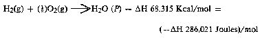 2H2 + O2 ===> 2H2O - .DELTA.H 68.315 Kcal/mol (this is the enthalpy, or heat of combustion at constant pressure)