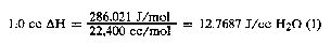 To simplify the calculations, the energy required to produce 1.0 cc of H2O as the gases, H2 and (1/2)O2 was determined. There are (under standard conditions) 22,400 cc = V, of gas in one mole of H2O. Therefore,