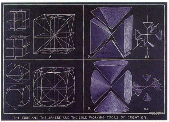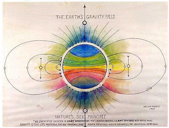| "This universe of motion is a universe of PRODUCTION, DESTRUCTION and REPRODUCTION. All form is produced by the male, electro-positive, plus action of the charging, electric oscillation of the universal life principle, is destroyed by the female, electro-negative, minus reaction of the discharging, magnetic oscillation, and is reproduced through the union of both by radio-active regeneration of inertia." [Russell, The Universal One] |