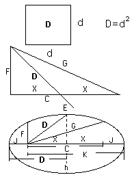 The "doubling" of the roots is not a true doubling in the mathematical sense, but this doubling does "double" the value of all the other identities within the ellipse. Thus, the doubling of 1, 1, 2, 3 will give us 2, 1, 3, 4, but these two combinations are the roots of the 3, 4, 5, triangle and of the 6, 8, 10 triangle, which is a double of the first. The measurements of J, C/2, D, and K, along the major diameter of the same ellipse will be 2, 2, 4, 6 for the first roots and will be 6, 3, 9,12 for the second. This not a true doubling. The doubling occurs only in the triangle. A true doubling of the major diameter could not be because this ellipse is much more elliptical, but the triangle is truly doubled in its dimensions and quadrupled in its area. Along with that it is turned by ninety degrees in itself and within the ellipse which it represents. (see ROTATION herein for more information)