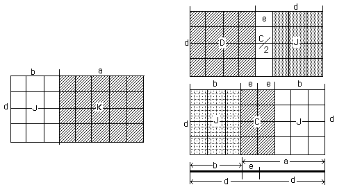 Capital letters are areas. Lower case are distances. b+e=d, e+d=a.
